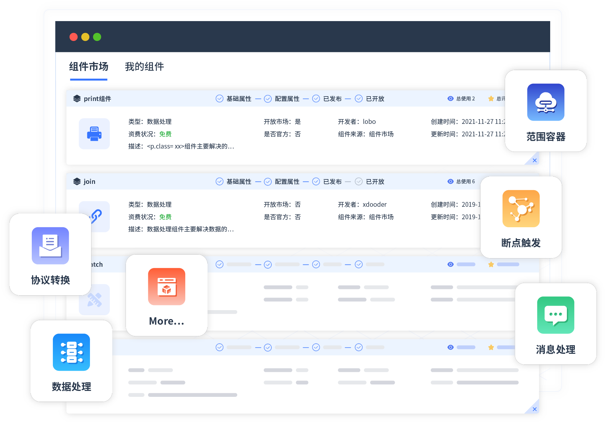 针对集成场景,征途国际pg提供组件市场,例如协议转换、消息处理、文件操作等。除平台提供的组件外,客户可以自定义所需组件。